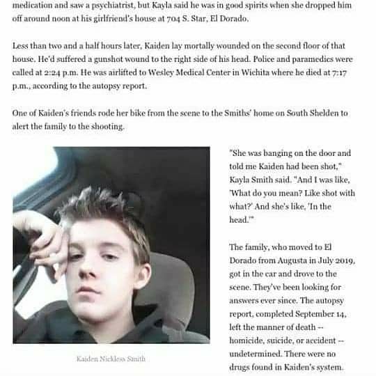 Kaiden Smith was a 14 year old child that died under suspicious circumstances at the hands of gun violence. His death was ruled a suicide solely based on a mental health diagnosis. Critical evidence and conflicting eye witness accounts have been ignored. His parents are desperate for answers and have been manipulated by certain people related to the incident.