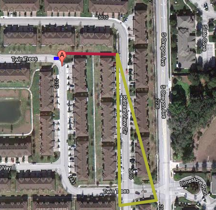 I'm saying he probably parked where the blue rectangle is located. He then went along the magenta path while talking to the dispatcher, and realized he lost Martin when he came to the perpendicular pathway. Since he believes Martin is going towards the back entrance, it would make sense that he would continue alone the same magenta pathway so he will have roughly the viewpoint notated by the yellow triangle. He would be able to see if Martin was running towards the back entrance, or off to another house... If he ran to another house, Zimmerman would be able to tell police approximately where he went - this may be the confusion about Zimmerman saying he was trying to get an address.
