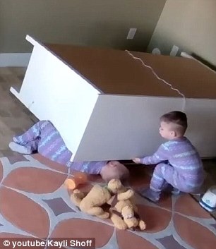 It doesn't seem like this child trapped under the dresser is in any real danger. He even survives when his "rescuing" twin climbs on top of the dresser, further pinning the child beneath the dresser. This looks like a very light weight dresser - the child pinned underneath is just kind of held in place. Dangerous dressers are very very heavy ones - that can injure a child.