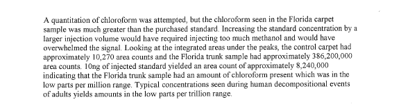 The amount of chloroform found in the trunk was measured in the low parts per million range, where as normal human decomposition is low parts per trillion range. One trillion is one million million.