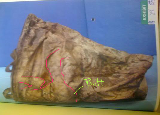 -The whole thing goes into the laundry bag as is, with Caylee head and torso down, maybe bent a little so she would actually be on her back/shoulder blades if the trash/laundry bags were set upright....