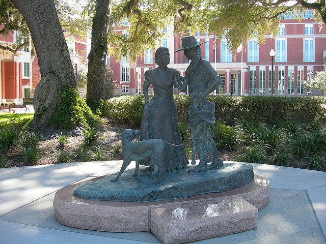 For those who live in the Orlando area- What is the significance of them walking past those statues, of a man and a woman, the man is in a 'cowboy' hat ... maybe early settlers? is it something to do with Justice? I'm trying to figure out if there is a hidden metaphor.