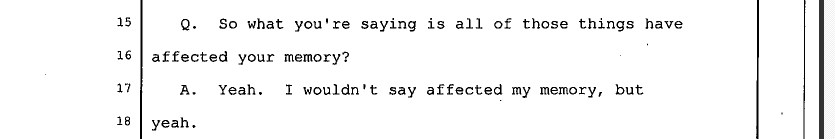 The reason this stuck out is because in one of the AL lectures she discussed how too much time elapsing between the crime and a depo can help the juror take testimony with a grain of salt. Kind of like...how did they remember that detail and not this one?