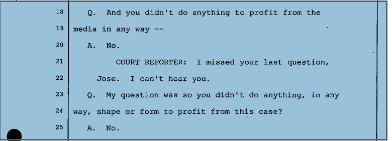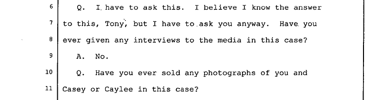 JB asked whether Tony had given any media interviews and if he had sold any pictures to the media. The next snip shows where he asked Tony if he had profited from the media in the case.