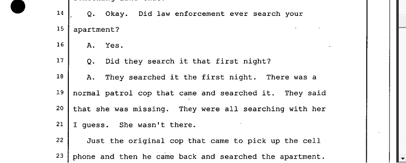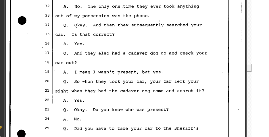 Apparently Tony's car was checked with cadaver dogs. I must have missed this tidbit. I found interesting, the line of questioning. I now understand the questioning about the other car from the Frye hearing.