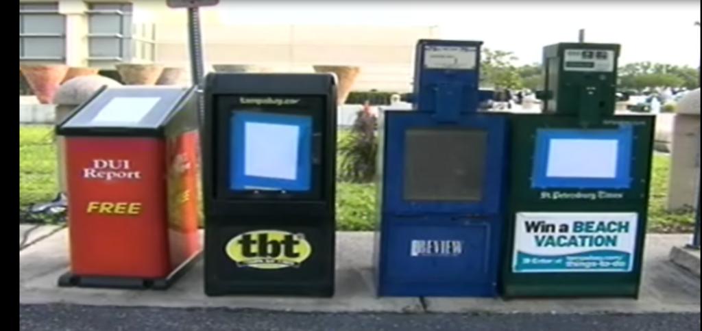 In Session shots of the newspaper machines outside the courthouse being taped up.
