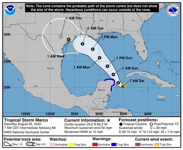 "Gusty winds, dangerous storm surge, and heavy rainfall are expected from Marco along portions of the Gulf Coast beginning later today,” explained the National Weather Service in an advisory. “Interests in these areas should follow any advice given by government officials.”