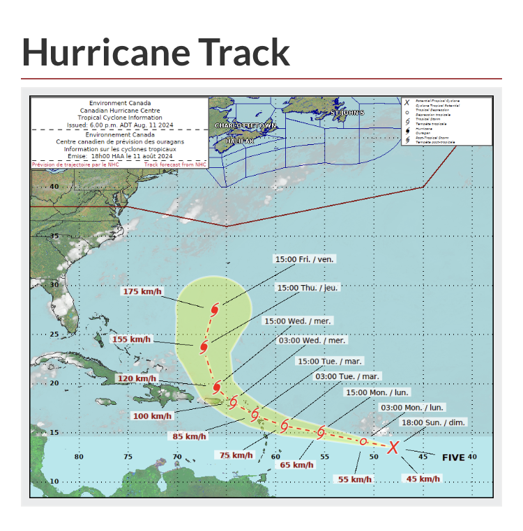 Tropical Storm Ernesto will be impacting the eastern Caribbean today then strengthen to a hurricane as it threatens Bermuda late this week. The current consensus of weather models keeps the centre offshore as it approaches Atlantic Canada early next week.”