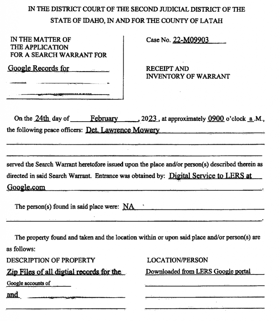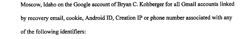 RE google -scope to Jan 2021- I noticed those differences especially the zip file and the reference to gmail accounts linked by recovery email. I had the thought that certain on-line purchases may have been done under a different name and through alternate gmail accounts or even separate google accounts on different devices. Could be that one/some of the prior sealed google warrants ( if for BK) uncovered some indication of another account he had set up under alternative email? Just some thoughts and moo.