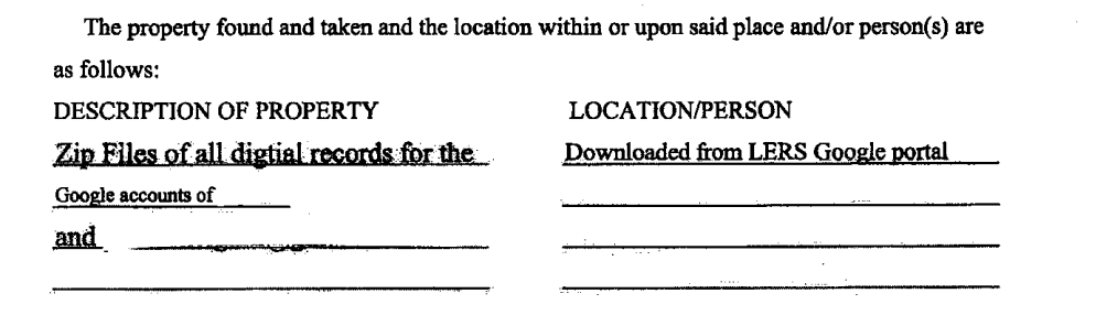 *No specific mention in receipt of when email was received from Google directing to secure download (as is the usual case with other warrant receipts).