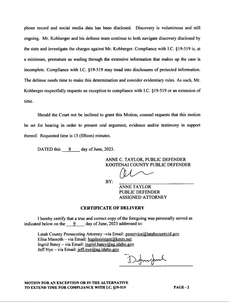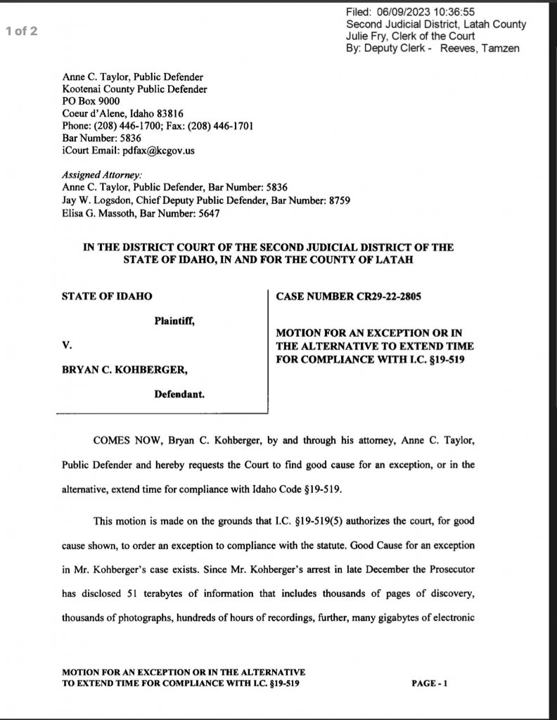 Thank you. @Cindizzi What???? BK wants more time to come up with/for his alibi. There's too much evidence; defense appears to be looking for an alibi in the prosecution's discovery evidence. Thompson does seem to know where BK was at the time of the murders; maybe defense hasn't found that page yet.