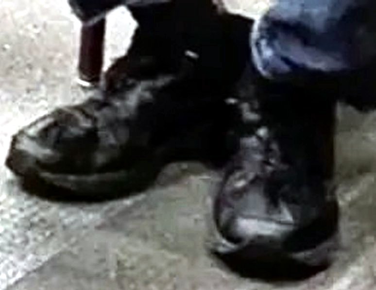 Trying this again. Messed with effects, and it seems like the bottom of the shoes are almost the same color as the floor. Which would mean they're like normal tennis shoes / sneakers without what looked like a gap under the instep/arch. Makes a lot more sense and looks like there could be other touches or gray (on the shoe). Not enough for me to recognize the brand, but the bottom of the shoe was really bothering me.