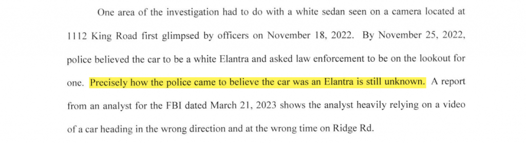 One area of the investigation had to do with white sedan seen on camera located at 1112 King Road first glimpsed by officers on November 18, 2022. By November 25, 2022, police believed the car to be white Elantra and asked law enforcement to be on the lookout for one. Precisely how the police came to believe the car was an Elantra is still unknown. A report from an analyst for the FBI dated March 21, 2023 shows the analyst heavily relying on video of car heading in the wrong direction and at the wrong time on Ridge Rd.