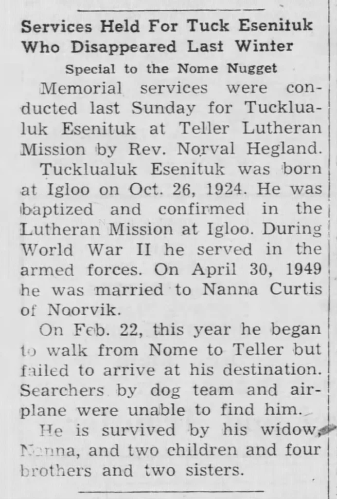 Esenituk was last seen in Brevig Mission, Alaska on June 1, 1961. He was supposedly traveling to Teller, Alaska. He has never been heard from again and his whereabouts remain unknown. Few details are available regarding his case.