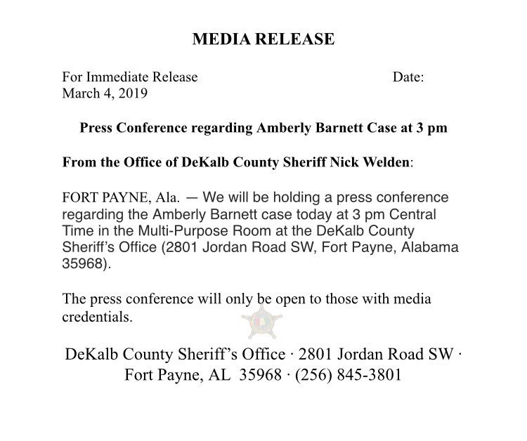 The DeKalb County Sheriff's Department will hold a press conference regarding the Amberly Barnett case today at 3 p.m. We will be present and live-stream the conference on Facebook.