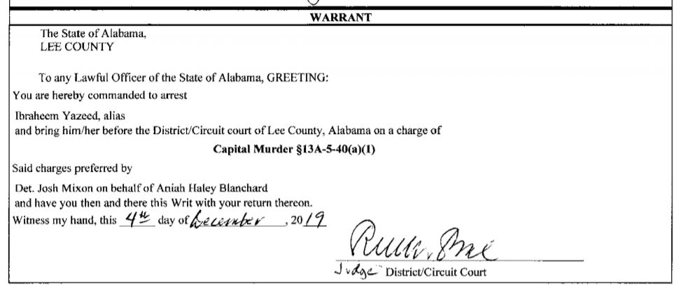 "In the interests of public safety, I can say that the investigation has determined Ibraheem Yazeed to be the lone person responsible for Aniah’s abduction and her murder and he remains in the Lee County jail without bond,'' Hughes said. “Mr. Yazeed remains innocent of any charges against him until his guilt is proven beyond a reasonable doubt.”