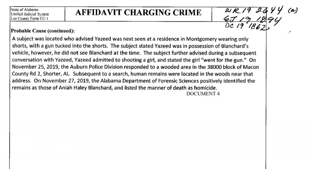 “Further video evidence was located from a separate gas station in Auburn depicting Yazeed exiting the passenger side of Blanchard’s vehicle and later re-entering the vehicle,” the document states.