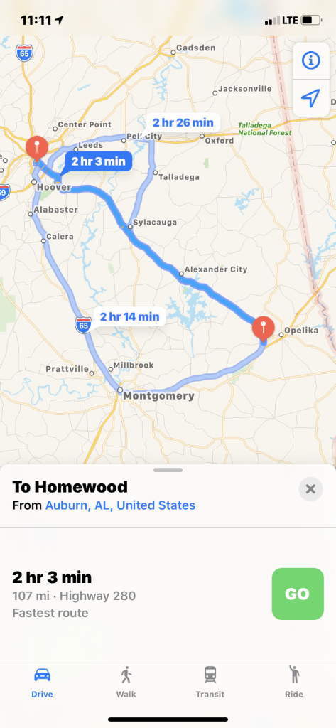 To those local... when I searched the distance from Homewood to Auburn the two routes offered were only about 10 minutes different. One route went through Montgomery. Is there any reason you would choose one over the other? One down 280 straight to Auburn , the other down 65 to Montgomery, then 85 to Auburn?
