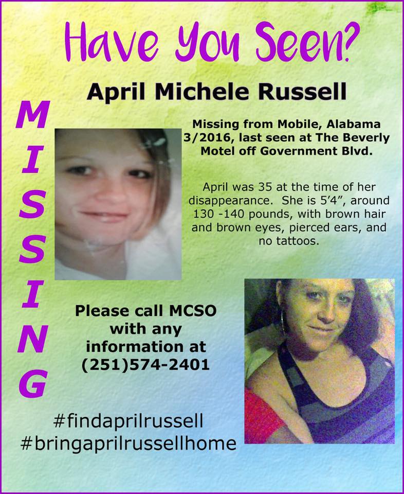 https://www.facebook.com/april.russell.908Russell was reported missing by her family May 6. They said the last time they spoke to Russell was in March.