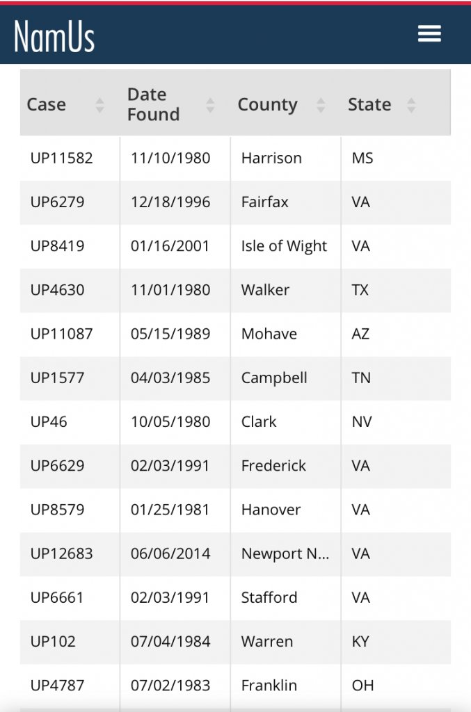 I’m attaching Carla’s current R/O list from NamUs. The Harrison County MS UID is the one I inquired about earlier this week.