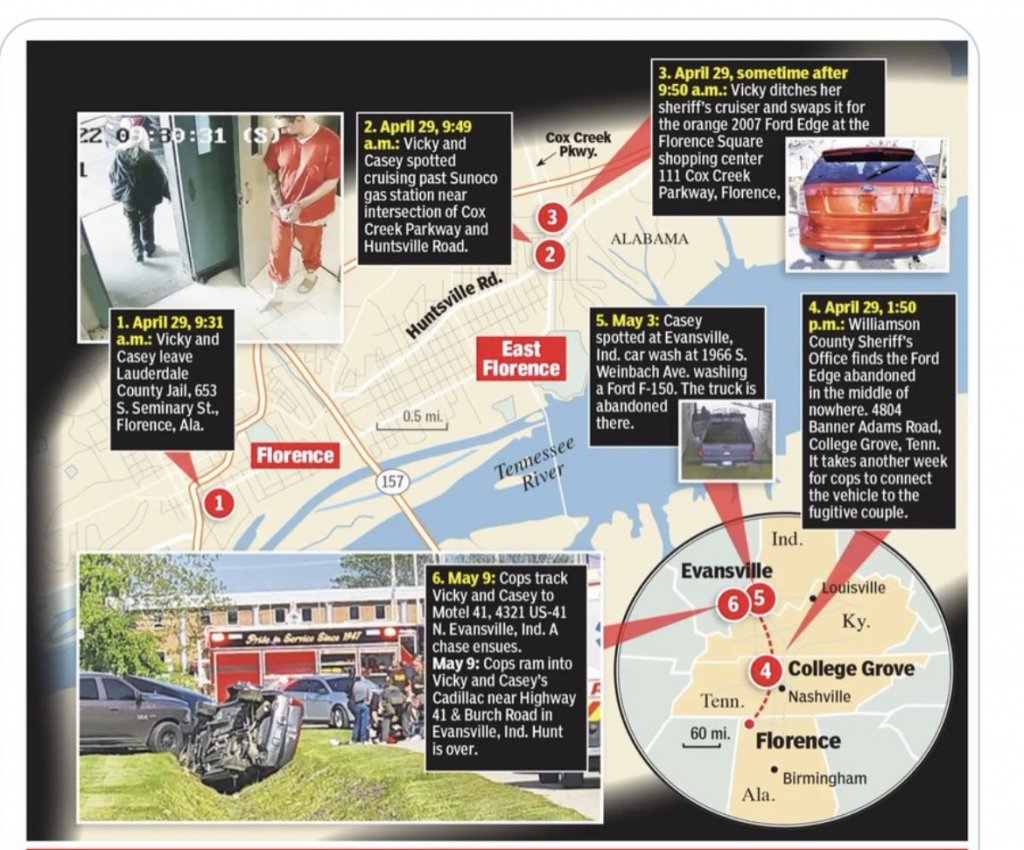 As officers pulled them from the wreckage, Casey White blurted out, “Please help my wife, she just shot herself in the head,” Keely said. It wasn’t clear why he referred to Vicky as his wife. Investigators quickly cuffed him and started rendering aid to Vicky as medical crews rushed to the scene.