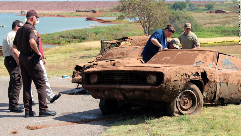 “Bodies, cars found in Oklahoma lake – Sheriff's deputies found two cars submerged in Oklahoma's Foss Lake in September 2013, and DNA tests recently confirmed that the human remains inside those cars matched the descriptions of six people who went missing in 1969 and 1970. The state Medical Examiner's Office said the victims died from drowning and their deaths were accidental.”