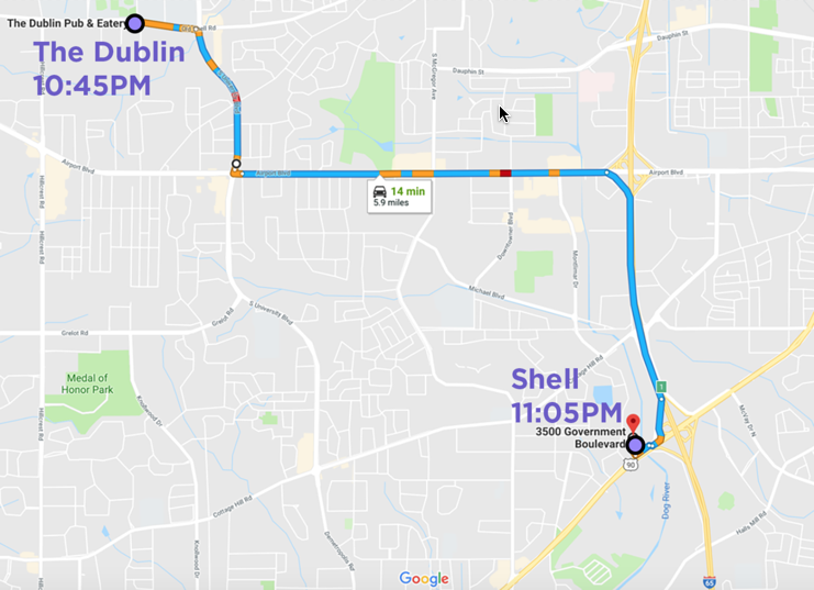 I would think at that point, the majority of the patrons at Dublins would have cleared out, so likely he could have pulled in pretty close to wherever they were previously parked and stopped to look. Maybe he didn't actually pull into a parking spot? If she'd given a pretty good indication of where she thought it was and had been certain it was outside, maybe he thought it would be a quick stop until she didn't show up? Also, he likely went over the speed limit- don't most maps take that into consideration when calculating the travel time?