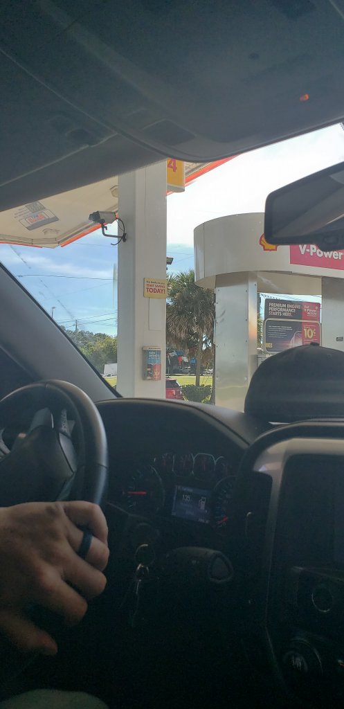 There are 2 sets of gas pumps that run parallel to the store. There is a camera on each post beside each pump that faces the pump beside it. They do not appear to actually be hooked up.