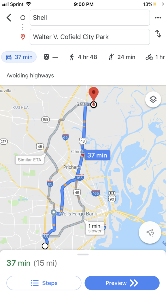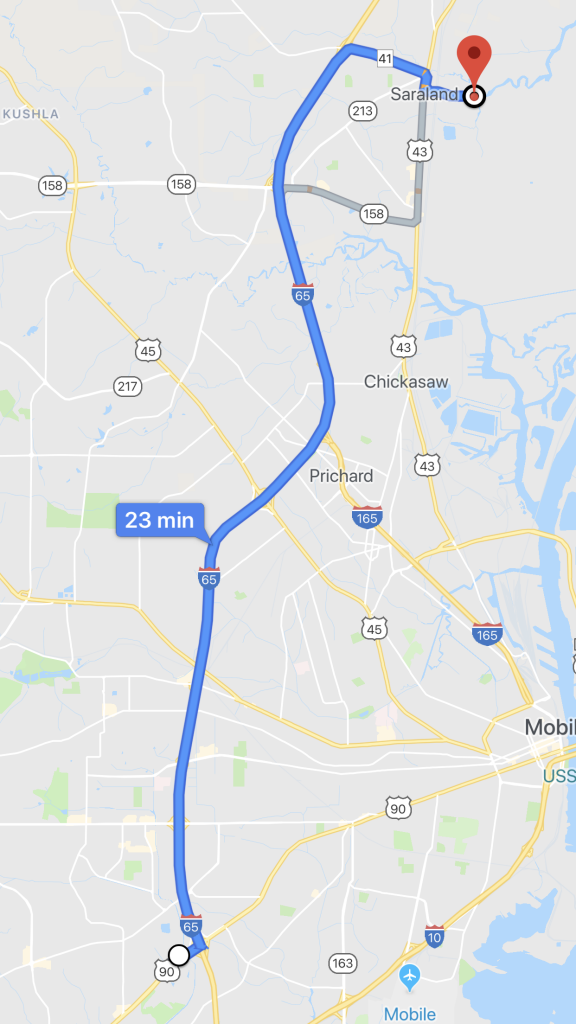 Here’s the interstate route and one taking the backroads. There are a few other backroads I can think of to get to Saraland. Regardless of the route taken from Mobile to Saraland there are only 2 ways to get to this particular area on Hwy 43, both of which have heard have surveillance cameras.
