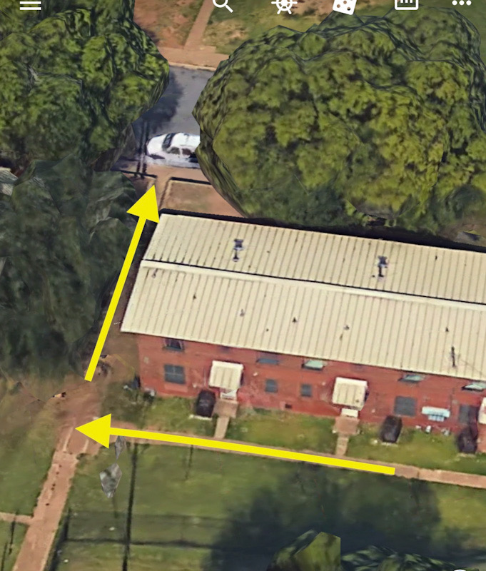 Based on these video footage locations, the suspect could easily have taken her to a vehicle parked on the street next to the front yard of the complex without being out in the open, by following a path to the right that goes under some trees before hitting the street.