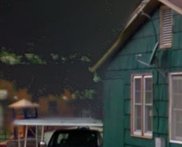 The daycare is to the left of the green houseNo,, day Care is in the green house next door. It as a aluminum carport with a truck. You can see in video.
