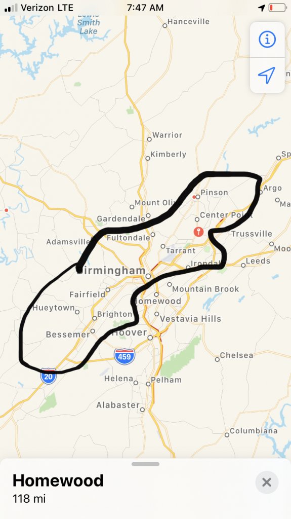 This area is south of Birmingham, and passes through “Homewood”, also mentioned in some reports.
