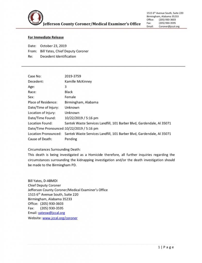 Jefferson Co. Coroner officially confirming the body found in a landfill yesterday is that of 3-year-old Kamille "Cupcake" McKinney. The death is ruled a homicide while her autopsy is being conducted. Cause of death is pending.