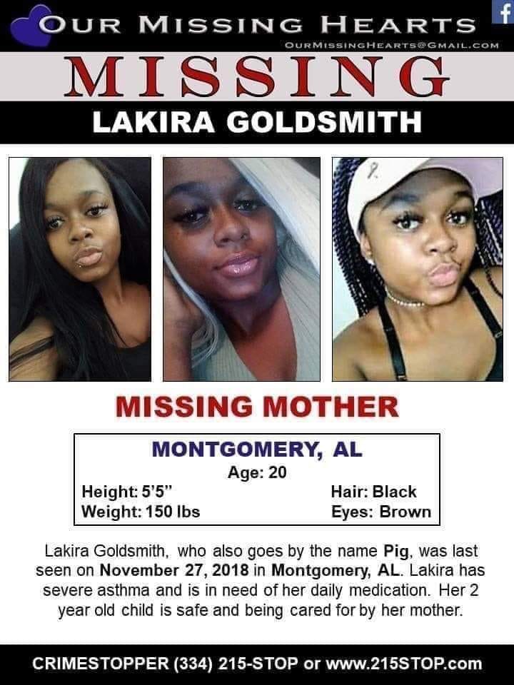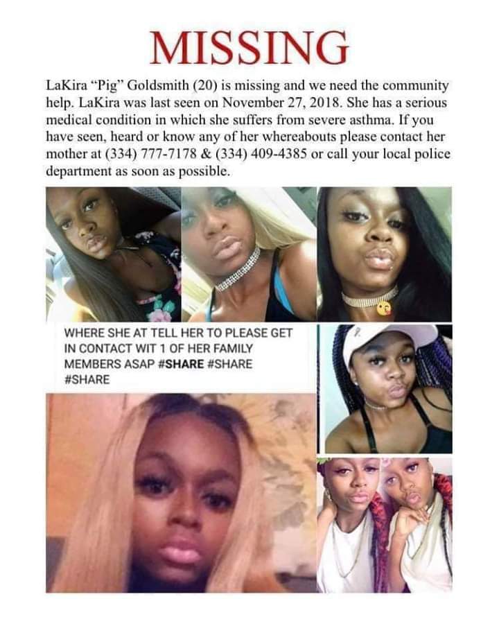 Lakira Goldsmith, 20, was reported missing on Nov. 27 at 8:59 p.m. She was reported missing from the 4500 block of Narrow Lane Road. She is 5-feet-5-inches and weighs about 150 pounds.
