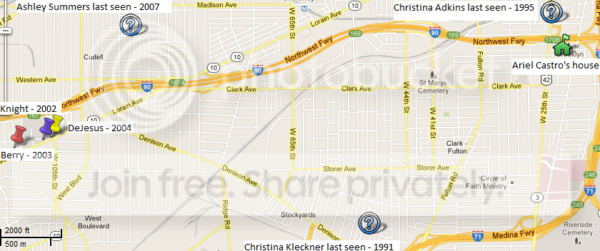 I am very concerned about these three girls not really being Castro's only three victims. The main reason I say that is because of hollye's wonderful map. I have used her map as a reference so that I could make an image to share here based on her work (and I am being careful to give credit where it is due :) ). Please note the scale of this - one inch is equal to 2000 feet. The very close proximity of these girls going missing to one another and to Castro's house makes me very suspicious.