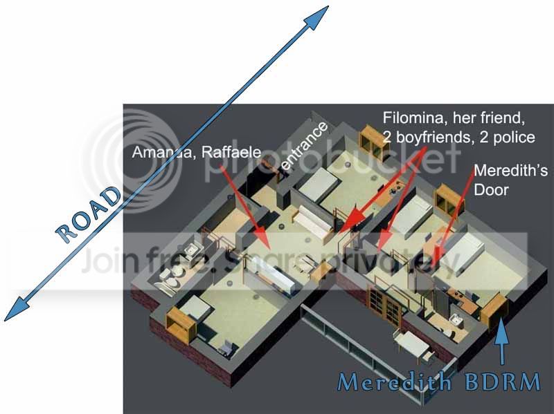This illustration was initially used to demonstrate where everyone was standing when police discovered the body, but I've re-purposed it to demonstrate why it is not at all surprising that someone on the road did not see what was going on in Meredith's bedroom, which was not at all visible from the curved, hilly road.