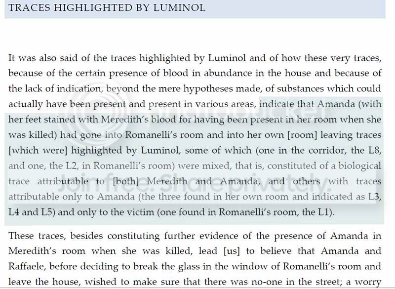 The wide open door, blood in the bathroom, blood on the light switch, blood on the bathmat, blood in the sink, blood in the bidet and so on did not concern Knox. Only the feces sounded the alarm, even though she herself was guilty of leaving feces in the toilet (reported by the English friends that this bothered Meredith). Scootching across the hallway apparently means that the luminal prints could not belong to her.