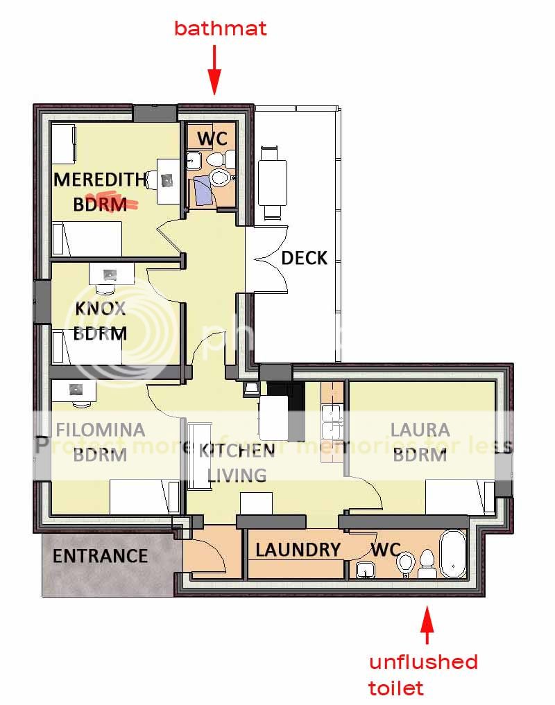 Here you can see the two bathrooms. After the murder, Guede left bloody shoe prints leading from Meredith's bedroom to the living room area and out the door.