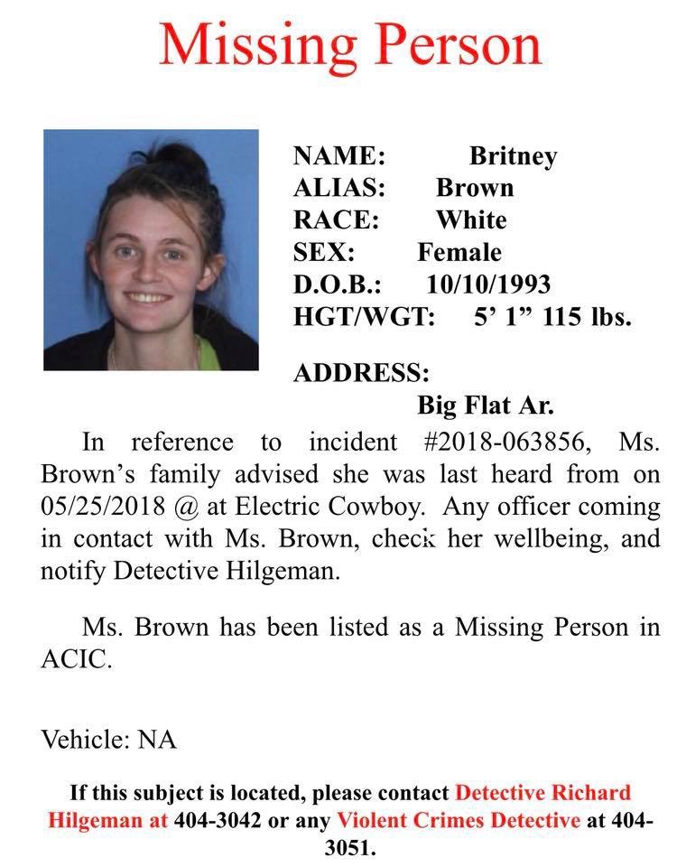 Brown is 5'1'', 115 lbs with brown hair. She's originally from Big Flat, Arkansas.