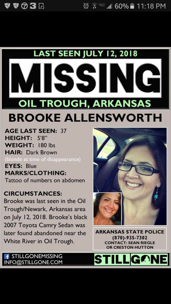 Brooke Allensworth is a mother of three. She was last seen in the Oil Trough/Newark, Arkansas area on July 12, 2018. Her black 2007 Toyota Camry was later located near the White River in Oil Trough. Brooke Allensworth is a Caucasian female. She is 37 years old. Brooke is described as 5’8″ tall and 180 pounds. Her hair is described as dark brown and her eyes are blue. Brooke has a tattoo of numbers of her abdomen.