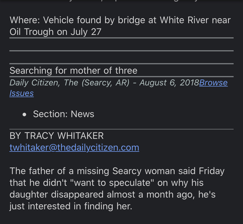Concerning the flat...Some articles mention a person stopping and putting Fix-a-Flat in the tire, while others only mentioned the flat as she parked her car under the bridge. LE never really mentions the person stopping; they talk more as if she had a flat, parked, and car was left there (willingly or unwillingly).