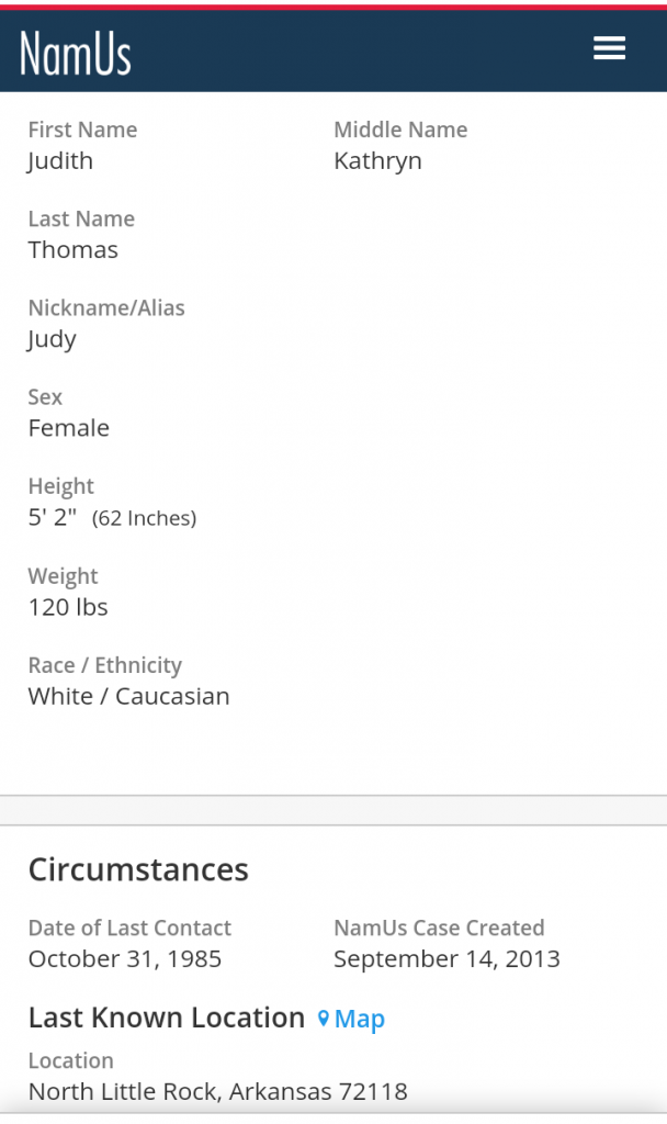 Here's screenshots from Judy's NamUs profile including 8 rule outs.