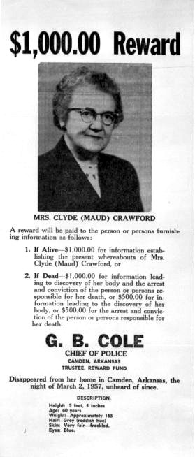 Maud was last seen at her residence on Clifton Street during the evening hours of March 2, 1957. Her husband, Clyde, went to a local movie theater and a liquor store during the night. Maud was sitting on her couch stringing beans when Clyde left their home. Clyde returned several hours later and saw that the lights were on inside the residence and on both porches. Their television set was turned on and Maud's pan of beans sat on a table. Her purse was inside the home and $142 was inside of her wallet. Several legal files were placed on a table. All of the doors were unlocked and Maud's vehicle was parked in their driveway with the keys in the ignition, the way she normally left the car for the evening. The Crawfords' dog was laying undisturbed on the floor. Nothing seemed amiss near the residence, but there was no sign of Maud at the scene. She has never been heard from again.