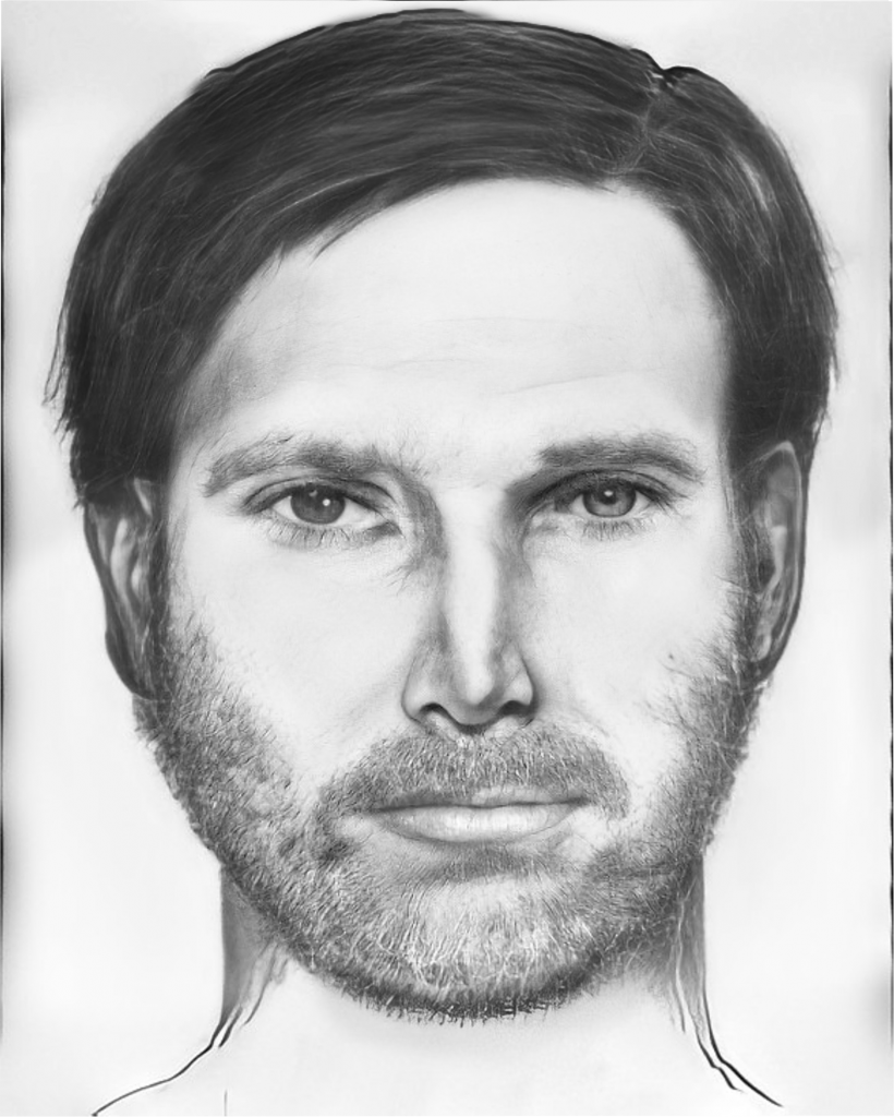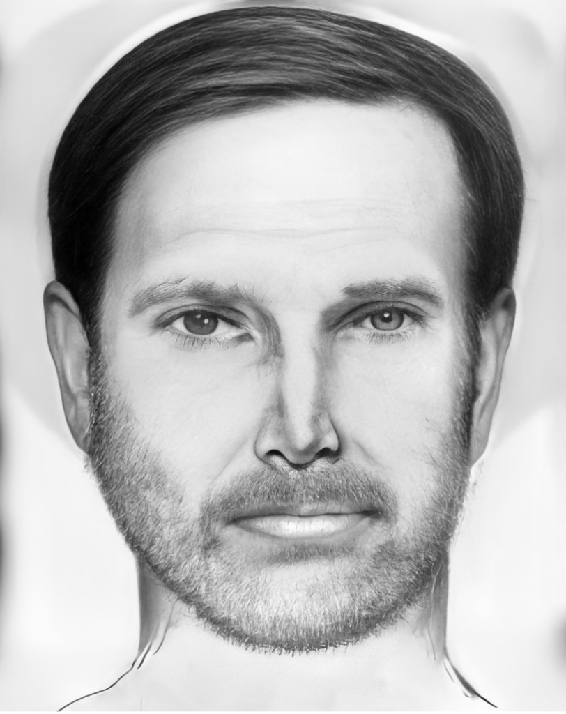 I don't know how helpful this will be, but I have attempted to run the composite sketch through AI to see what it would give me. This is a mix of Remini AI, ArtBreeder, and Adobe Photoshop Neural Filter "Smart Portrait". I tried to stay as close as possible to the original composite sketch. The "Smart Portrait" filter allows some aging effects which I tried. ArtBreeder immediately starts re-interpreting the sketch and changes it up a good deal, so I used very little of it - though I could see it being useful for actual eyewitnesses.