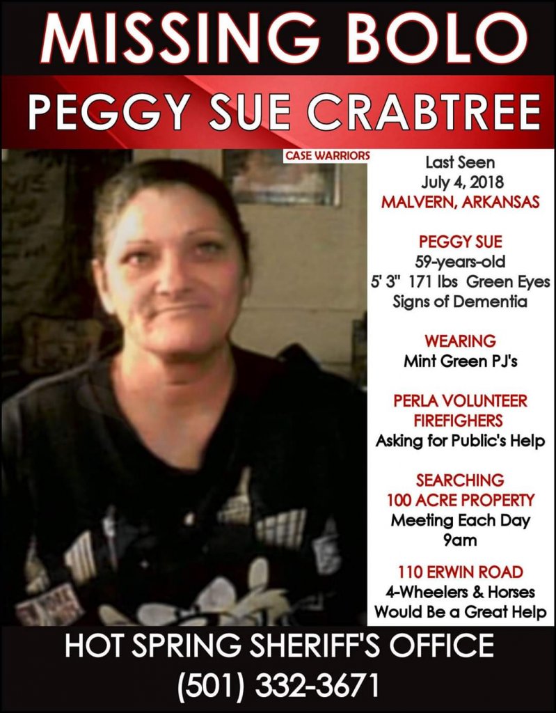 If you have any information that may lead to the location of Peggy Sue Crabtree, please call Sergeant Chris Maher, at (501) 332-7415."