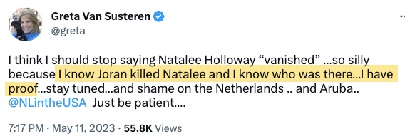 I'm curious why Greta van Susteren states "shame on the Netherlands and Aruba." It's not surprising that Natalee's mother is frustrated that no one was charged with the disappearance of her daughter, but Greta claims to have have proof that v.d.Sloot murdered Natalee. She also claims that there are accomplices and she knows their identities. The Netherlands isn't a developing country with an inferior judicial system. If there is proof, Dutch prosecutors would file charges.
