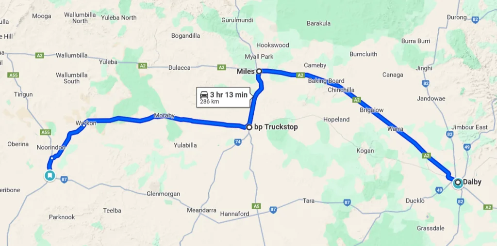 Dalby to Surat, via Miles and Condamine is 3hrs 13min, not including the time taken to fill up. It's 1hr and 47min from Dalby to BP. She should arrive in Surat, no stops - at 11.21am