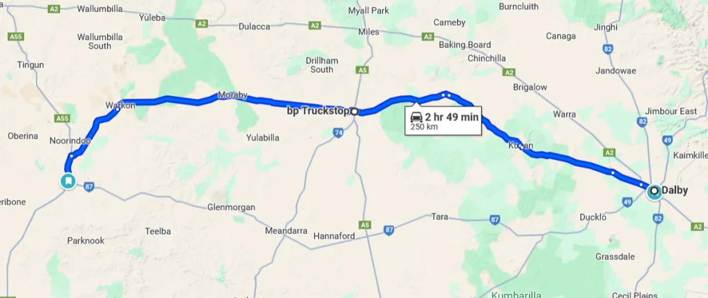 If we remove Miles; that's 2hr 49; again no stops; it's 1hr and 23 from Dalby to BP. Surat earliest would arrive is 10.57am.