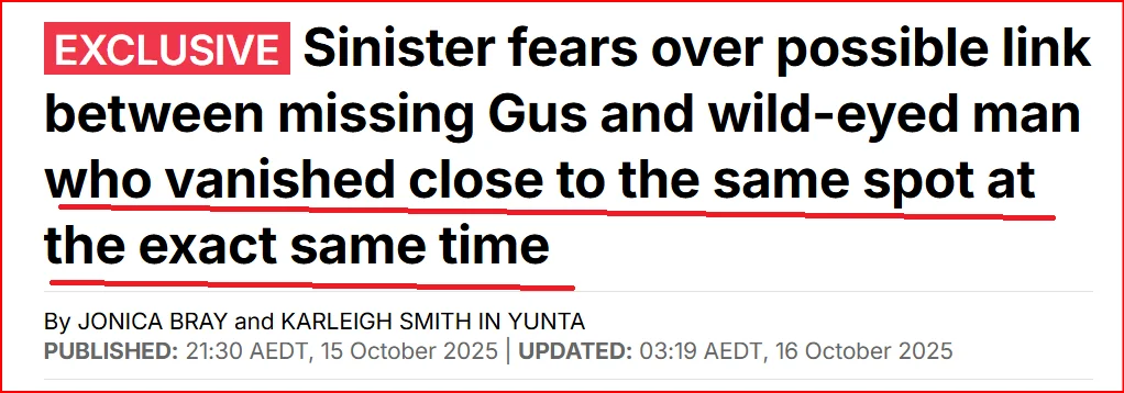 They report that there is a possible link between missing Gus and "wild-eyed man" who vanished close to the same spot at the exact same time ??????
