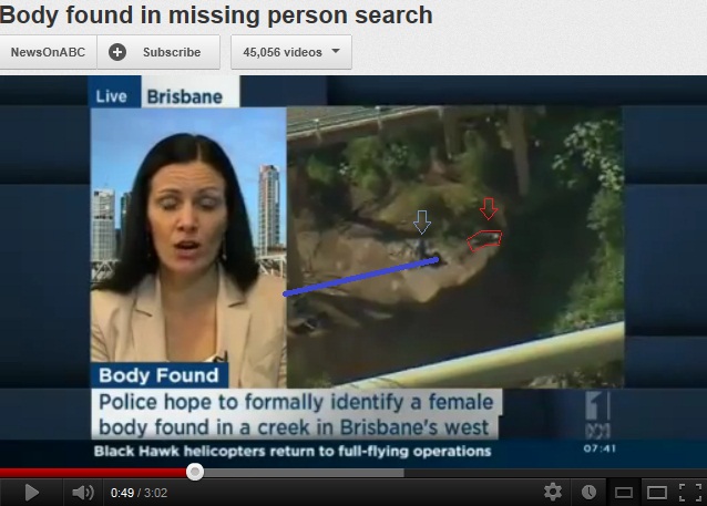 I have never posted anything in relation to the placement of Allisons body because, for all the photos and videos posted...I cant see it. With this image, the green outline looks to be at least twice the size of the other three people that I can see, so I have trouble seeing that this could be Allison. I have tried so so hard to see the body of Allison in all the images, but I just can't. The guy in the yellow forensics suit I see perfectly, the guy down below pointing I see perfectly. The guy to the left of yellow man, I see pretty well (facing away from the camera with a back pack?) but no body.